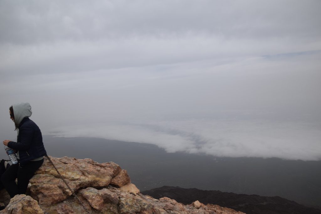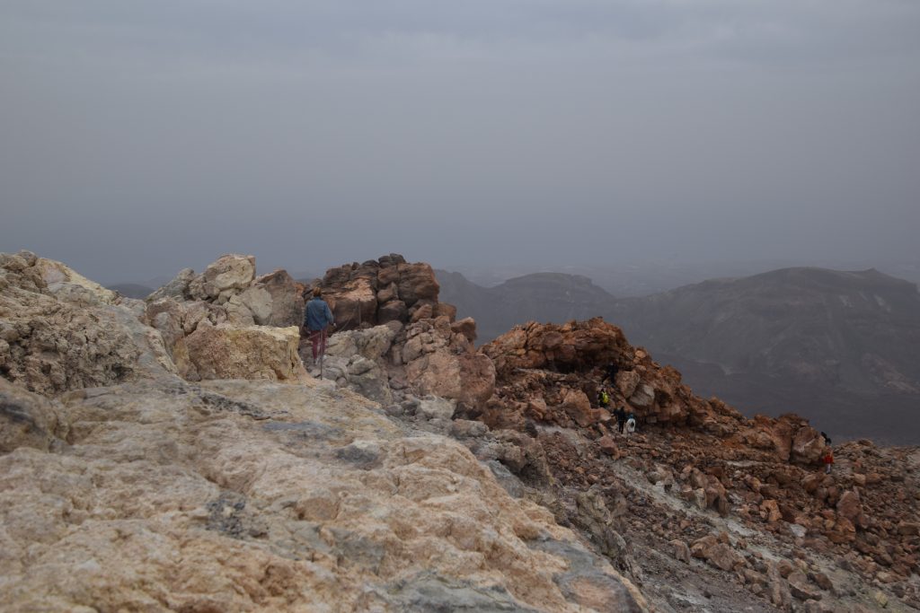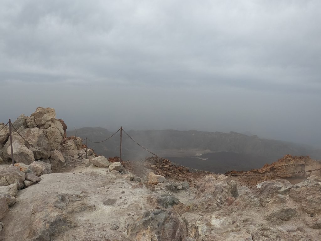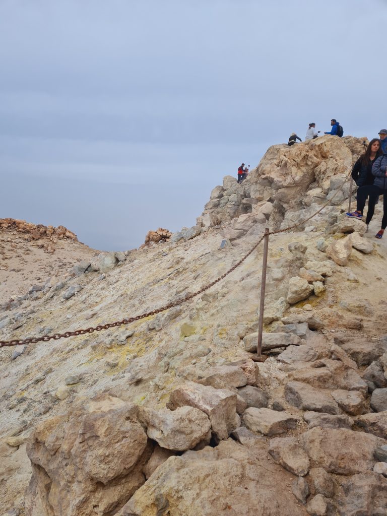 Le plus simple était fait : maintenant il faut monter au sommet du volcan. Pour une non sportive comme moi, le challenge était de taille. 613 mètres à parcourir, un dénivelé de 163 mètres et 40mn approximative (60 pour moi vu mon niveau sportif) de marche. Mais arrivée en haut : quelle fierté d’avoir réussi! Manque de chance pour nous, la brume était présente, ce qui fait que nous n’avions pas pu voir les paysages du haut du cratère. Mais la guide nous a fait découvrir des failles dans le volcan et nous avons pu y plonger nos mains et ainsi sentir la chaleur et l’humidité qui se dégage de ce volcan toujours en activité. Nous avons mêmepu voir des fumerolles